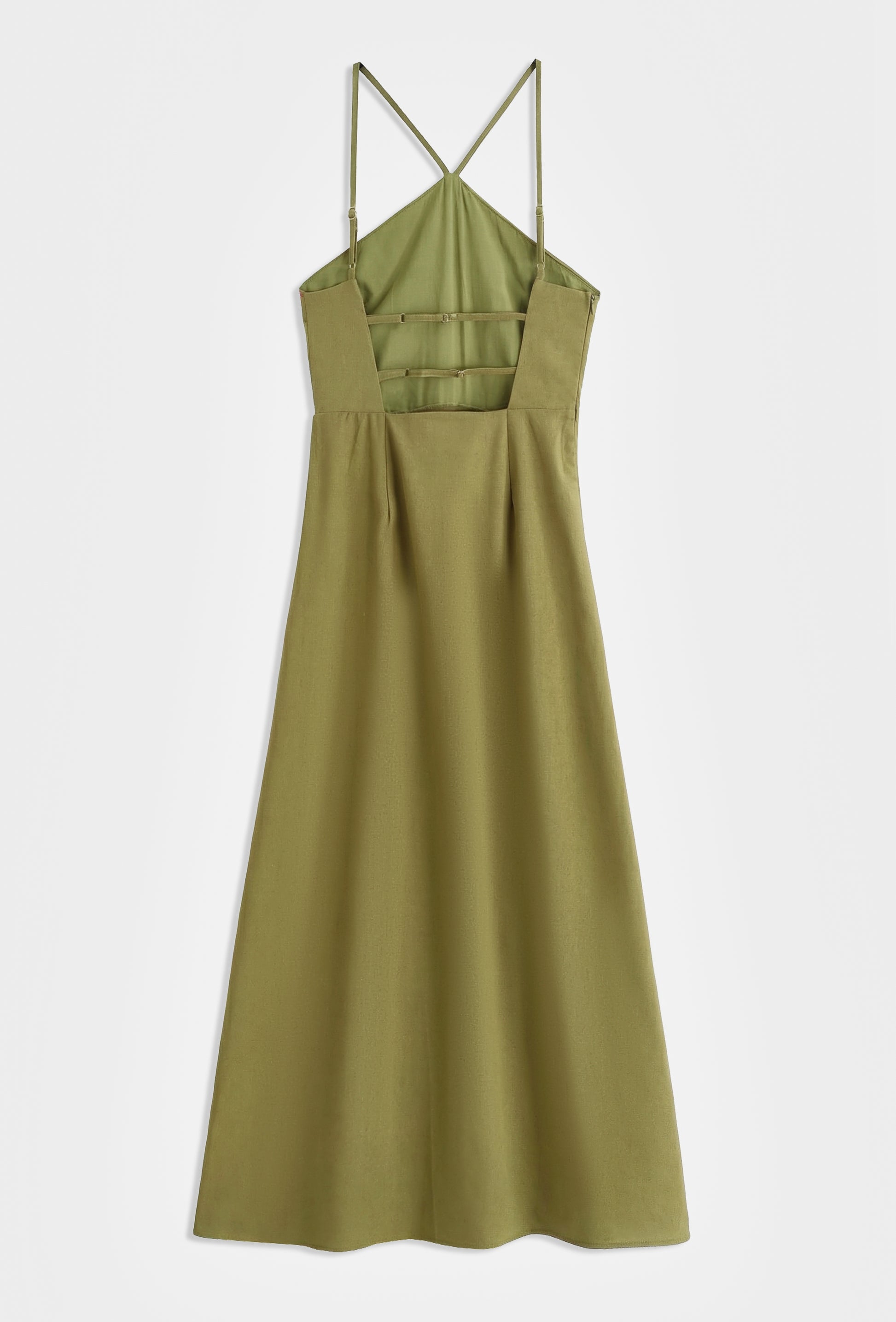 Robe mi-longue avec encolure américaine et fines bretelles ajsutables. Dos ouvert avec doubles brides horizontales ajustables et fermeture zippée dissimulée sur le côté. Jupe présentant une fente sur le devant ornée de boutons métalliques fantaisie.